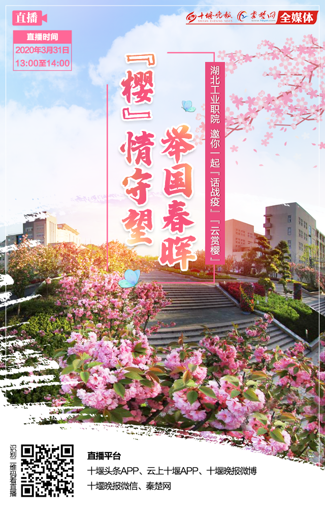 “疫”路同行、“樱”你更美!眼下,半岛的樱花似海。往年的春天,广大师生和市民都能在校园近距离赏花。然而,突如其来的重大疫情,打乱了人们的工作生活节奏。在习近平总书记亲自指挥、亲自部署和全国人民共同奋斗下,疫情虽已快速有效遏制,我国战疫取得阶段性重大成果,但全球疫情蔓延,输入风险仍高。根据有关要求,湖工职院仍处于严格封闭状态。为弥补大家不能入校赏花的缺憾,3月31日中午1点至2点,十堰晚报秦楚网通过网络直播,邀请你一起云赏樱,在家欣赏校园美景,感受校园文化。届时,十堰晚报秦楚网全媒体直播团队将出动高清4K直播车,为你带来不一样的赏花体验。你可以通过十堰头条APP、云上十堰APP、十堰晚报微博、十堰晚报微信、秦楚网在在线观看,并可与美女主播一起在线互动。