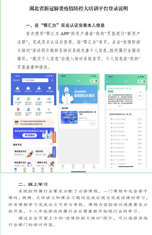 各级疫情防控机构和专兼职人员需下载“鄂汇办APP”,完成“新用户注册”,实名认证后登录。在“鄂汇办”半岛,点击“疫情防控大培训”滚动图片跳转至培训系统完善个人信息,根据自己所属行业据实填写,系统按照不同行业需求自动分配必修课程,一门课程中包含若干课时,视频、文字讲义和课后习题均完成后视为完成该课时学习,所有课程学习完成后方可参与考核。经线上考核合格的参训人员可获得培训合格证明。
