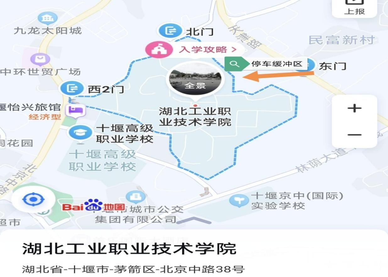 4.为确保防疫安全,家长、陪同人员及车辆谢绝入校,还请同学们和各位家长理解。我校在十堰汽车站、火车站、高铁站、机场均有迎新接待,校内安排有充足的志愿者帮助同学们完成报到手续,请大家放心。大家务必做好旅途疫情防护,要尽量在家吃饱喝足,途中全程带好口罩,途中尽可能不就餐或少就餐,尽量减少口罩摘取次数。如必须自驾送行,只能从学校东门(天津路大门)进入缓冲带停车。如下指示图: